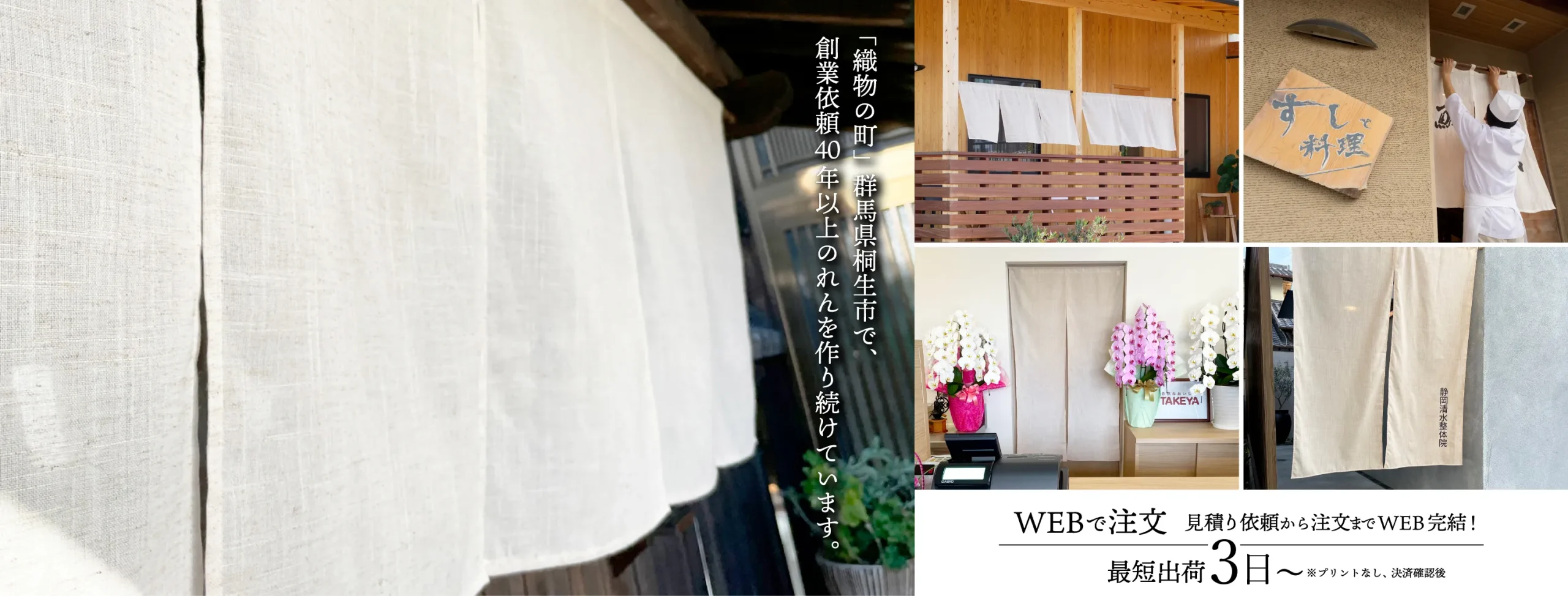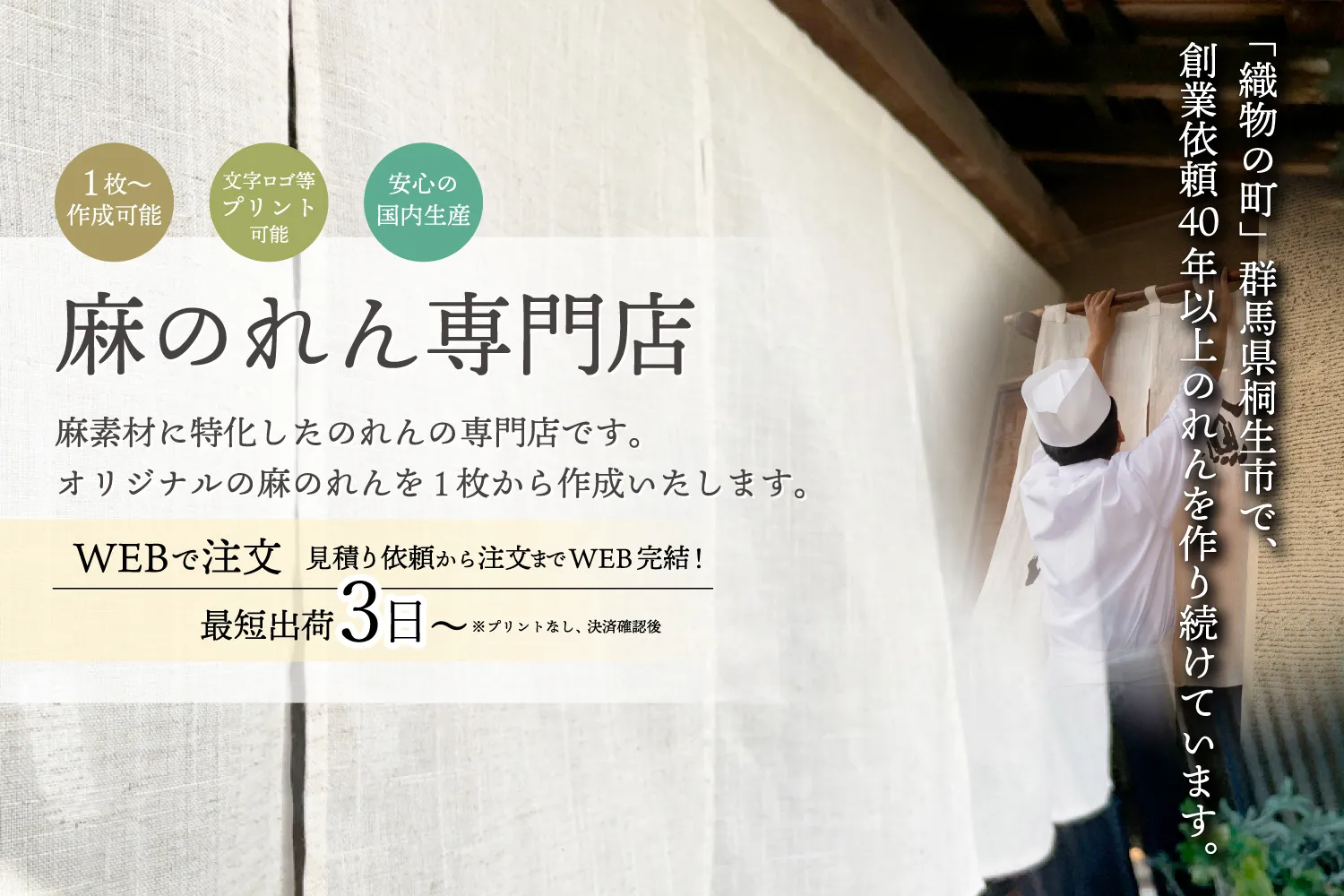 当店は、織物の町・群馬県桐生市で40年以上続くのれんメーカーが手がける、麻のれん専門店です。 麻素材の生地や麻風の生地を使用したのれんは自然な透け感と涼しげな風合いが特徴で、家庭の間仕切りから店舗の演出まで幅広くご利用いただけます。 お客様の理想の一枚をお作りします。お気軽にご相談ください。